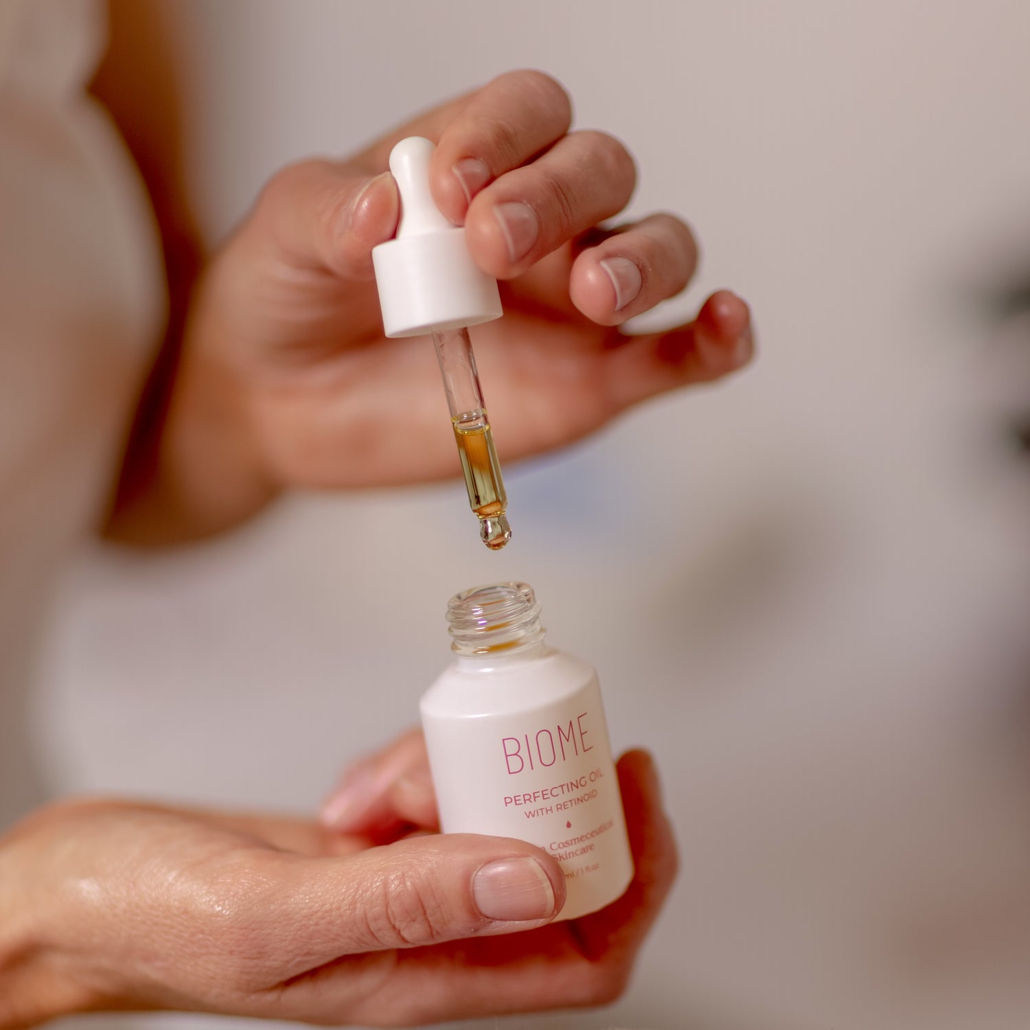 Biome Perfecting Oil blends granactive retinoid with potent botanicals, harnessing advanced cosmeceutical science to transform your skin overnight.