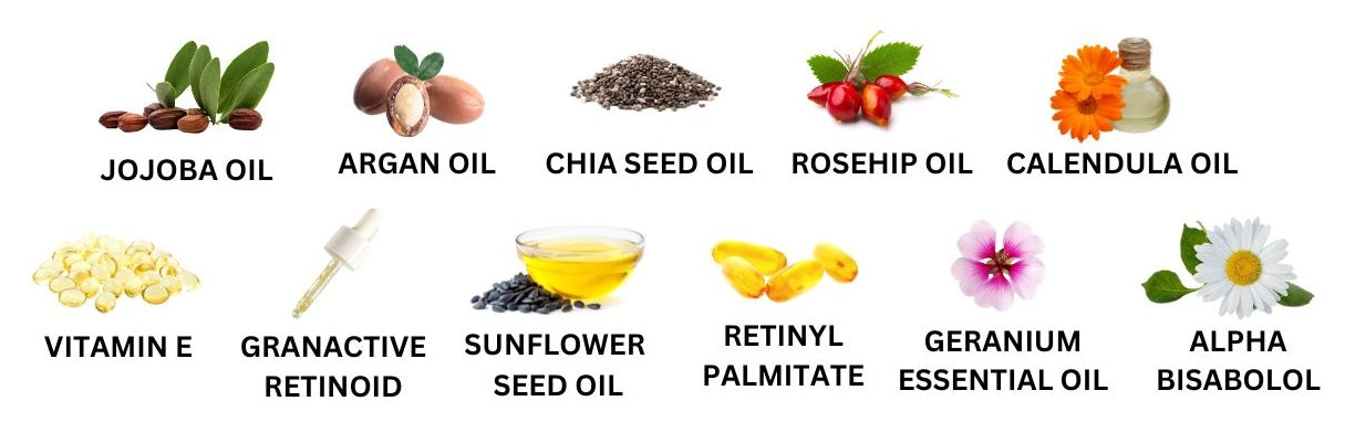 Simmondsia Chinensis (Jojoba) Seed Oil, Argania Spinosa Kernel (Argan) Oil, Salvia Hispanica Seed (Chia Seed) Extract, Rosa Canina Fruit (Rosehip) Oil, Heptyl Undecylenate, Helianthus Annuus (Sunflower) Seed Oil, Calendula Officinalis Flower Extract, Glyceryl Caprylate, Dimethyl Isosorbide, Hydroxypinacolone Retinoate, Tocopherol, Alpha Bisabolol, Retinyl Palmitate, Pelargonium Graveolens (Geranium) Leaf Oil 87.4% of ingredients are sourced from organic farming.